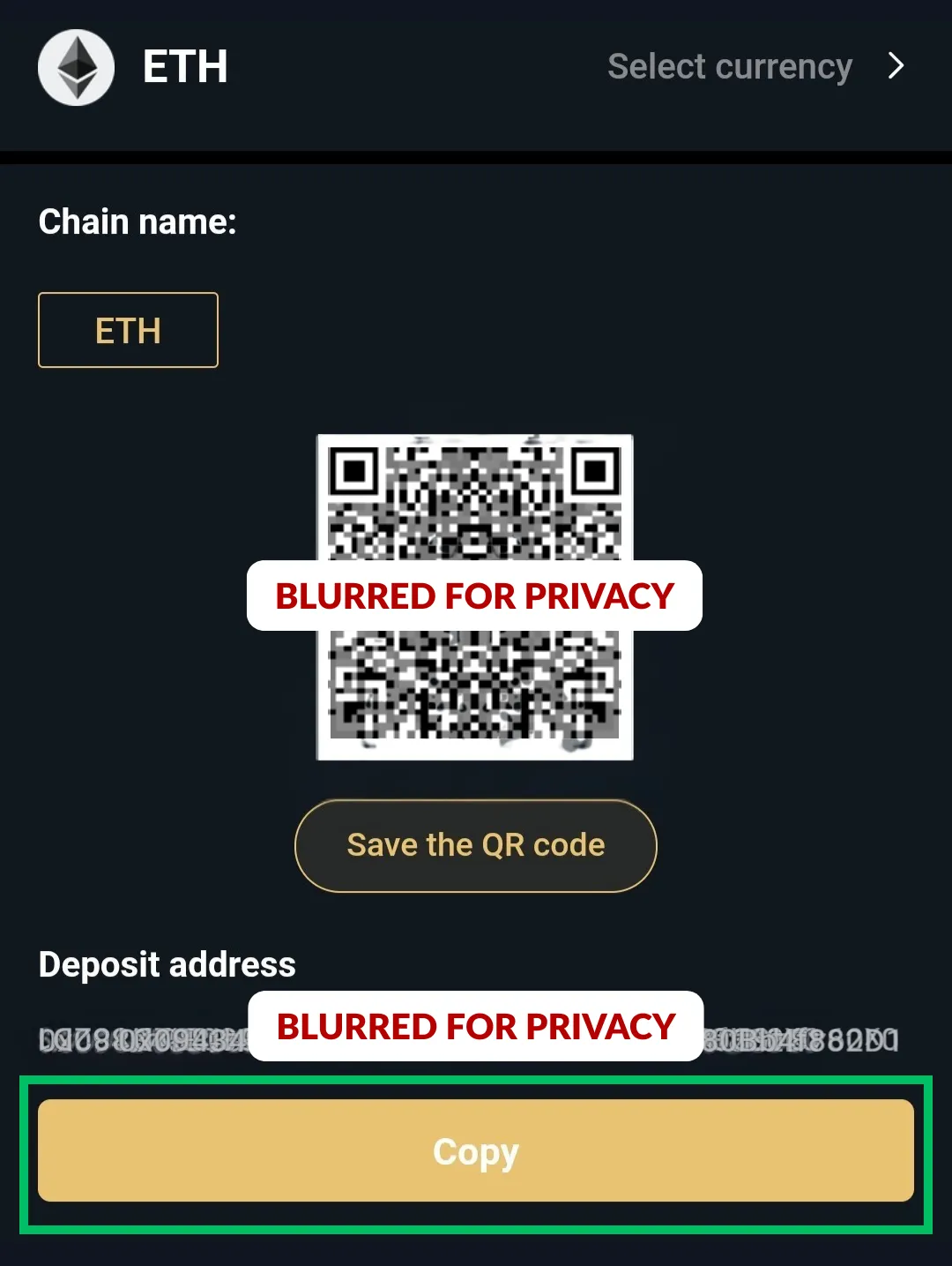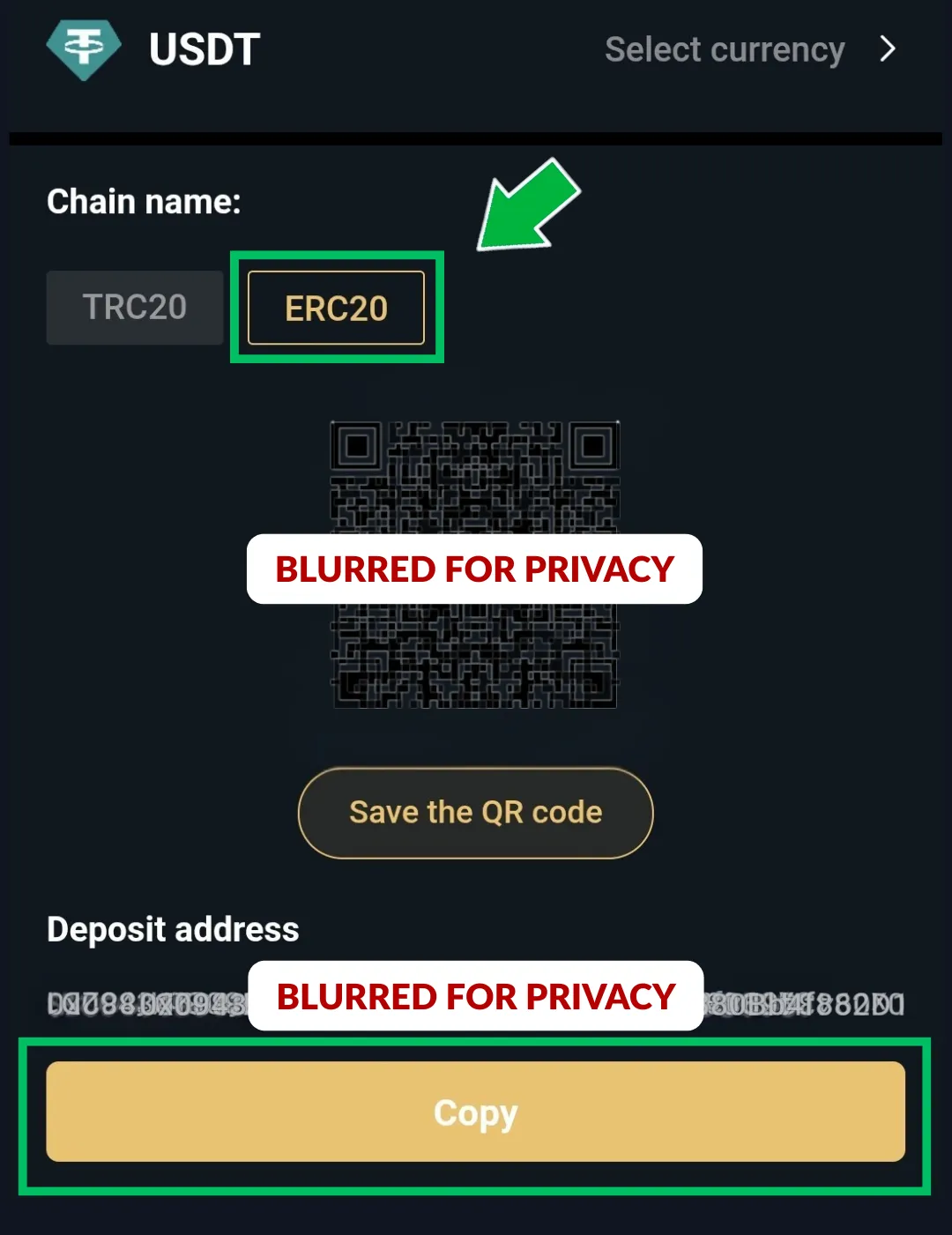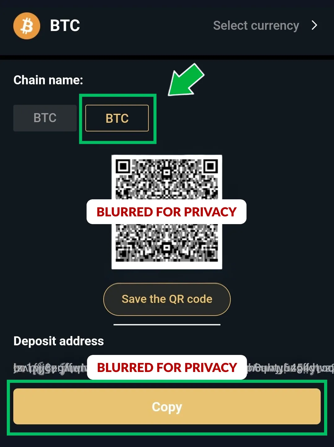 Select the Currency Type You Purchased on Your Crypto Platform (BTC, ETH, USDT, or USDC)